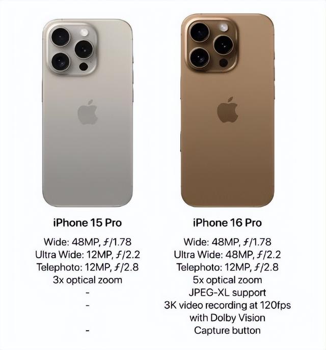 Pro机型会把3X光学变焦升级为5X光学变焦。同时还会支持每秒120帧的3K视频录制以及杜比视界,以及支持全新的JPEG-XL格式。值得一提的是,苹果这次又增加了一个物理按键,在锁屏键正下方新增了一个电容式拍摄按键。