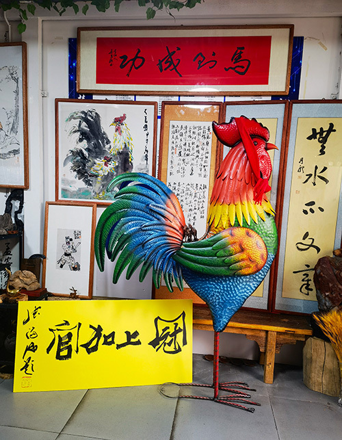最让大家关注的,则是一楼展厅摆放的高约1.8米的巨型金属“大公鸡”。鸡在传统文化中具有独特寓意,作为与人类相伴数千年的动物,鸡早已超越了家禽本身,成为了承载着丰富文化内涵的符号,被视为勤奋、守信、吉祥的象征。古代常以“闻鸡起舞”激励人们珍惜时光、奋发向上。一些地方还会在庭院中摆放鸡的雕塑,或在新房入住时抱鸡进门,希望借助鸡的灵性守护家宅平安、吉祥如意。
