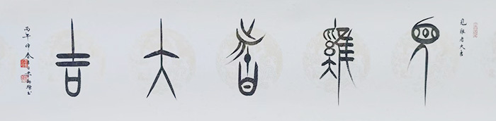 有感于传统文化中鸡的吉祥寓意,河北省中山国文化研究会副会长米勤练应大家提议书写了一幅“见鸡者大吉”,这几个字以中山篆体所写。他介绍说,中山篆出自战国中山王器铭文,是中山国的标准书体,有“最美古文字”之称。其字形修长优美,橫如椽檐,竖若悬针,曲直宛转有度,灵动多姿,富有韵律,与中山国人慷慨正直、包容并蓄、能屈能伸的民族风格一脉相承。书写“见鸡者大吉”,祝福大家在今后的日子里平安顺遂、健康如意。