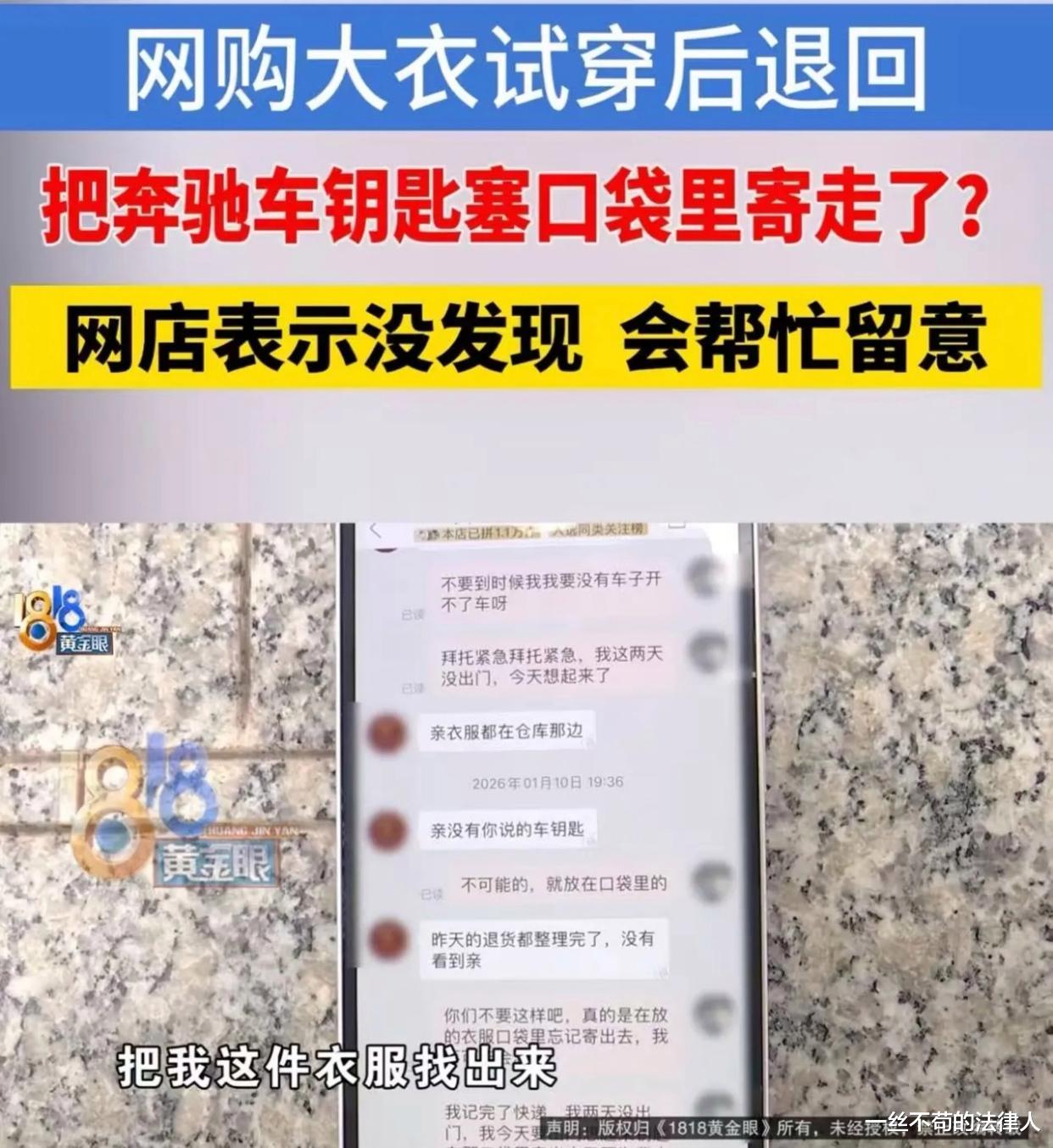 嘉兴的沈女士网购了一件158元的大衣,因在车内试穿不合身直接退货,却把价值6000多元的奔驰车钥匙遗忘在口袋里一并寄走。商家表示退货已重新售出,没发现钥匙。这场由“马虎”引发的纠纷,损失究竟该谁担?背后暴露的退货流程漏洞,值得每一位网购者警惕。