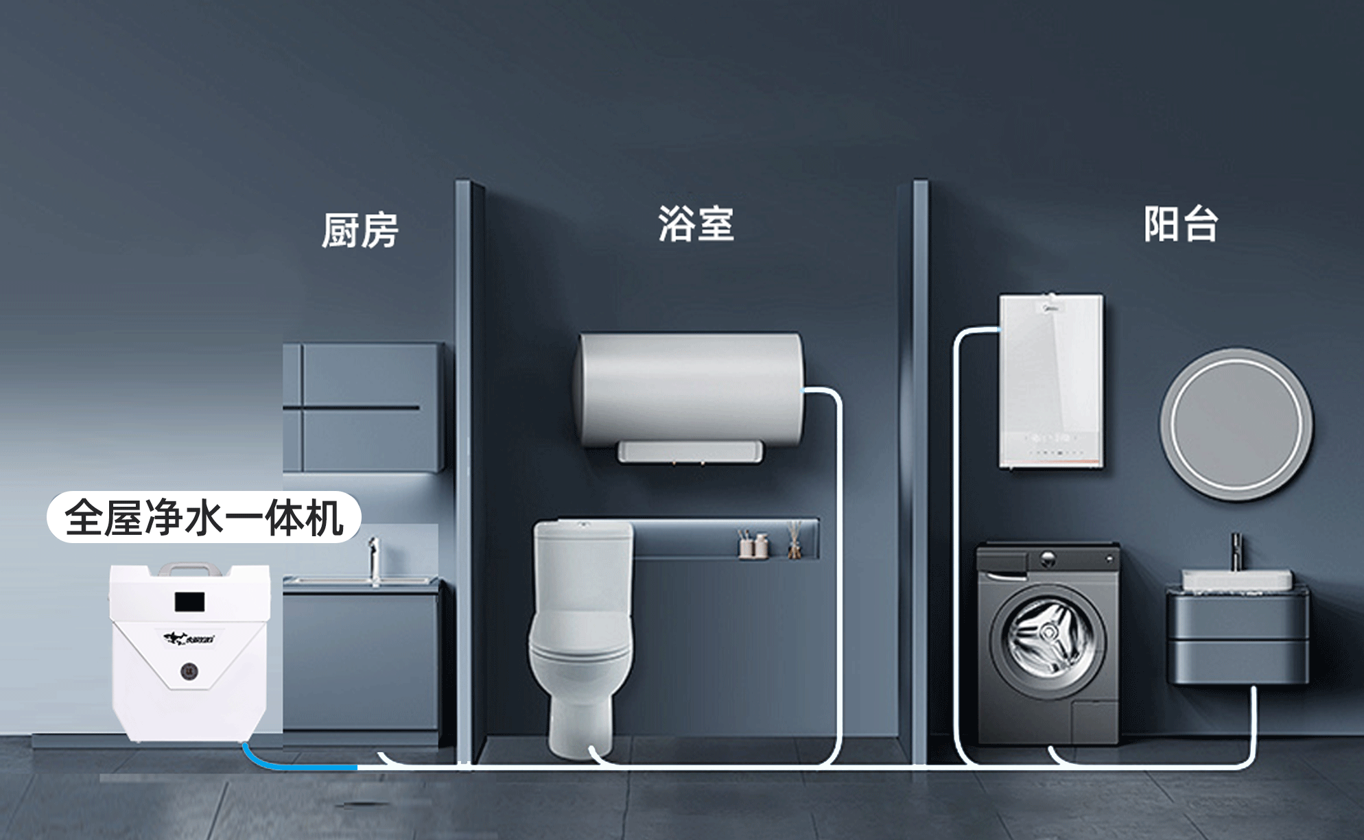 二、覆盖全家用水场景,稳稳的保险真正的全屋净水,不止于厨房。它能全面覆盖日常喝水、洗菜、做饭、洗衣、洗浴等所有场景,给全家用水稳稳上一道保险。