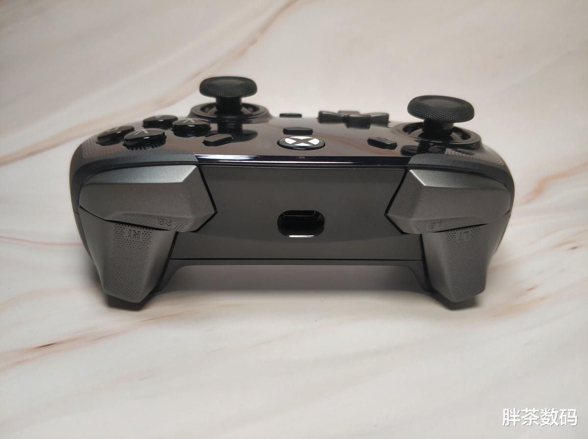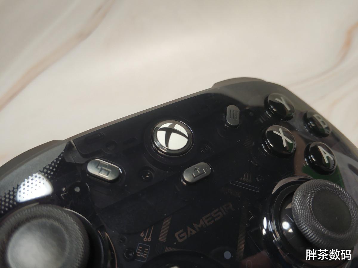 外观颜值相当不错,虽然整体采用了经典黑配色,但面壳采用了半透明设计,能清晰看到里面的电路设计和各元件的分布,相当有科技感。按键布局设计和XBOX的差不多,造型曲线简约流畅,让人惊喜的是,两侧隐藏有RGB灯带,能有效提升游戏氛围感。