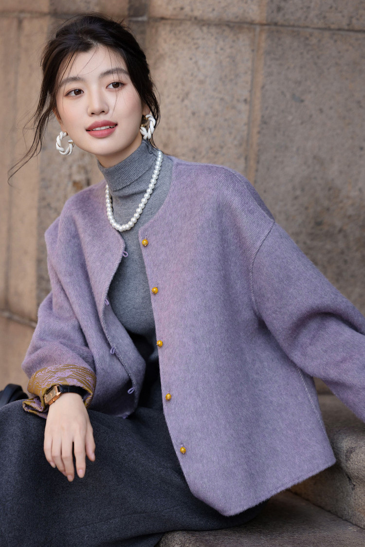 面料不对=廉价感拉满:亮闪闪的化纤面料+紫色,拍照反光又显浮肿;薄软易皱的卫衣面料贴肉显肚,还容易起静电炸毛。建议优先选针织、羊毛、醋酸、呢料等有质感的面料,柔中带挺,高级感自然流露。