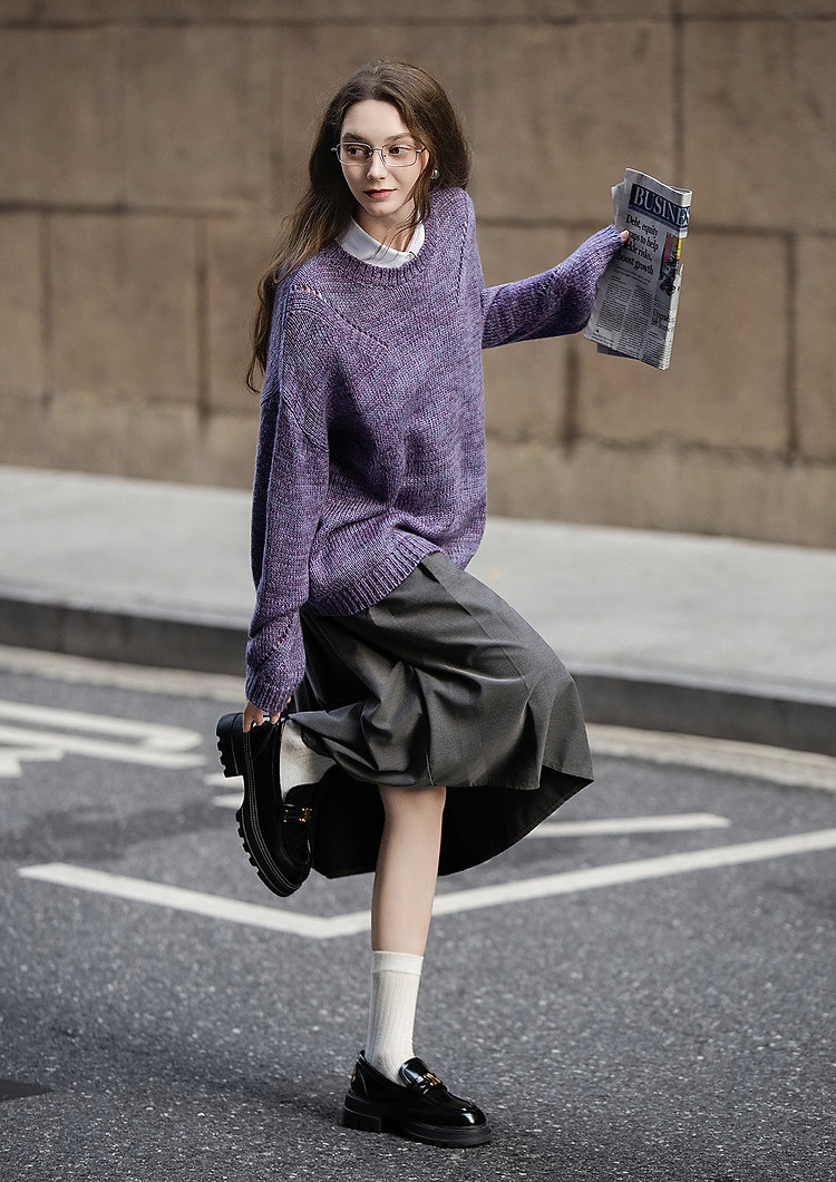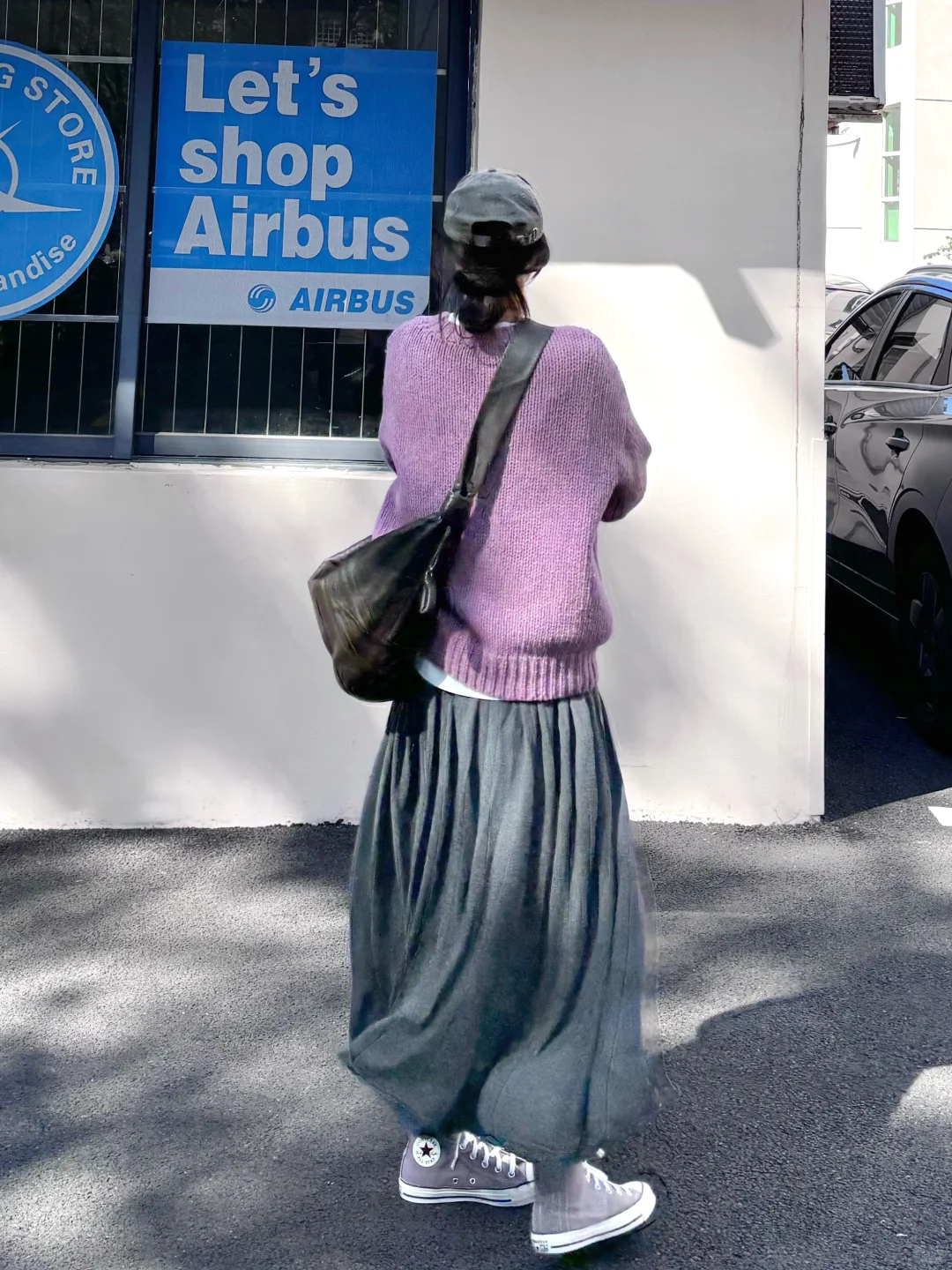 紫色针织衫配垂感大摆裙,再搭个做旧斜挎包,走路带风的松弛感直接拉满!不用费力搭配就很好看~