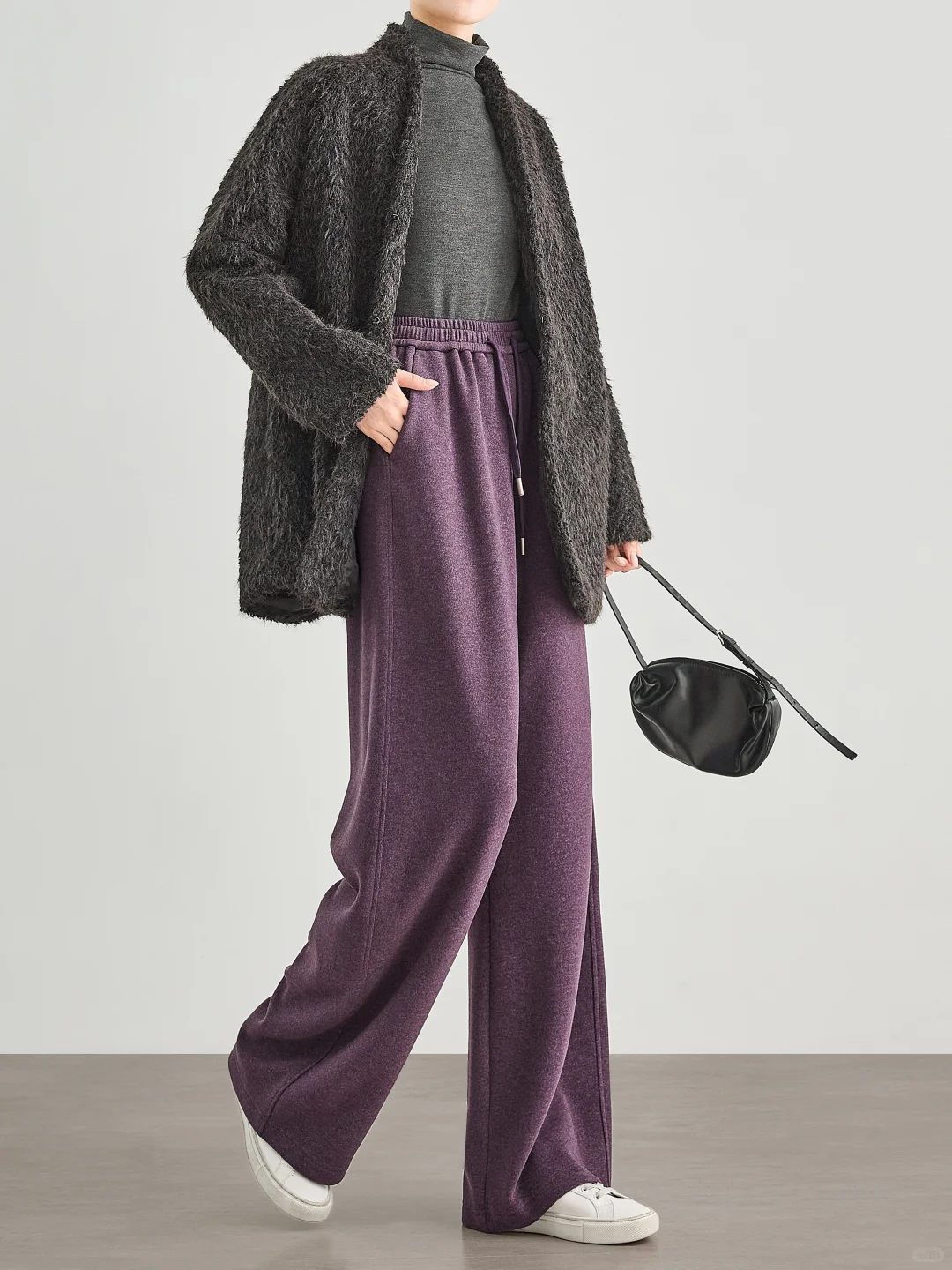 灰色外套内搭灰色高领打底衫,下身配一条深紫垂感阔腿裤,整套都是糯叽叽的质感,自带慵懒氛围,舒服到想焊在身上。