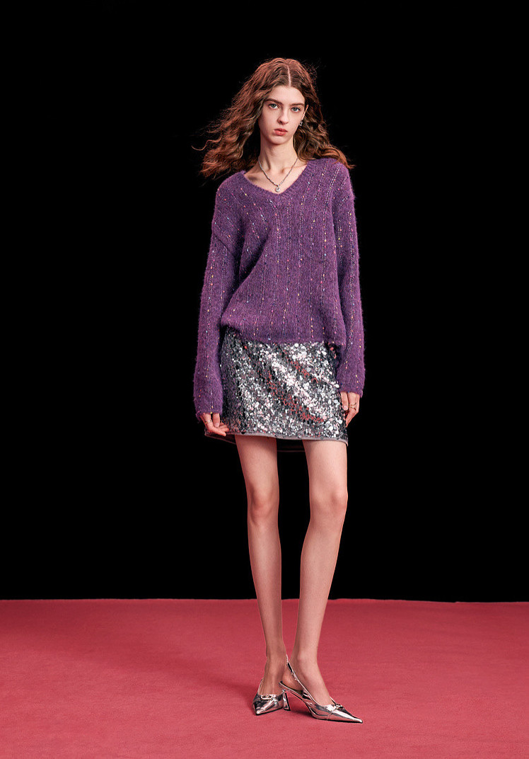 翻领紫毛衣自带温柔滤镜,搭配灰银闪片半裙瞬间提升精致感,一字领设计露出锁骨线条,闪片裙在灯光下 blingbling 自带高光,踩一双玛丽珍鞋复古又甜。