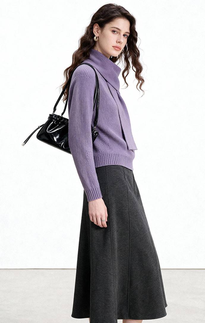 浅紫针织衫+紫色围脖设计,保暖又修饰颈部线条,搭配深灰大摆半裙垂感拉满,视觉上显瘦又显比例。