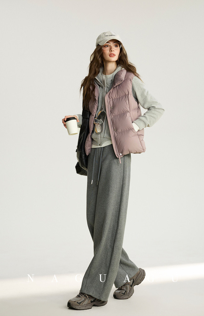 羽绒马甲配连帽卫衣,再搭条垂感阔腿裤,棒球帽和老爹鞋增加街头感。紫灰交织的暖意,是冬天不用追赶的松弛步调。