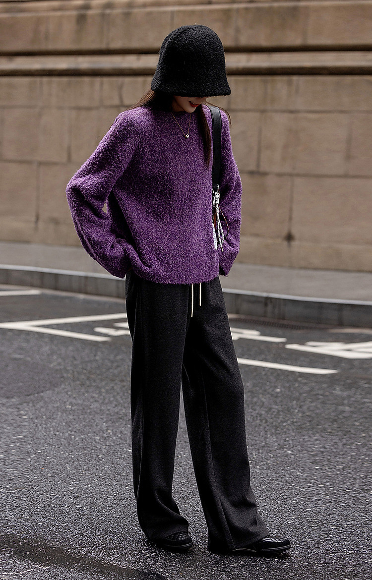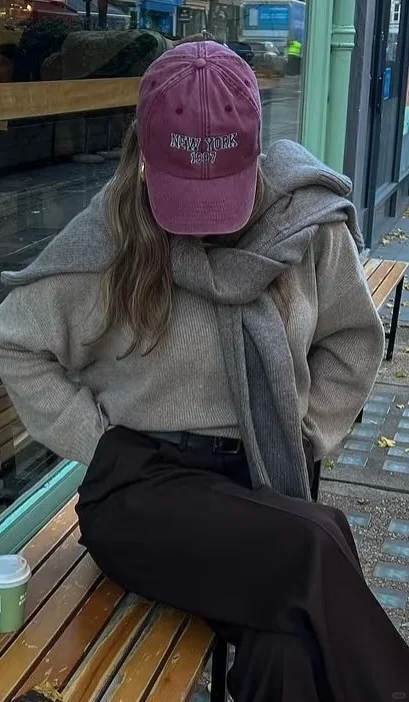 葡萄紫毛衣搭深灰直筒裤,配黑色帽子、皮鞋,全身上下色彩统一又有层次,静奢氛围直接拉满。