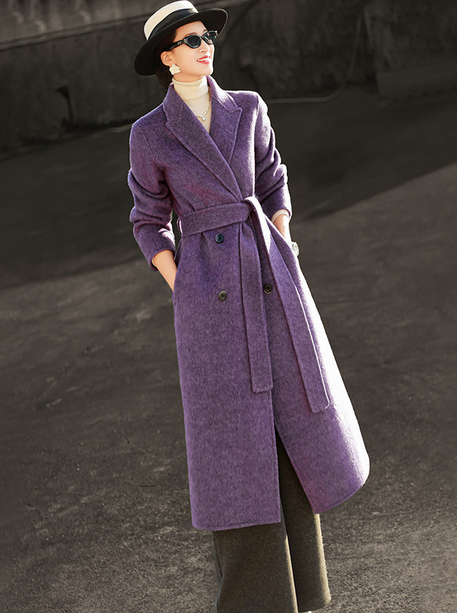 深紫毛呢大衣自带奢感,腰带收腰设计勾勒腰线,显高又显瘦,内搭米白高领打底提亮气色,深灰阔腿裤垂感拉满,视觉上延伸腿部线条。黑白拼色礼帽 + 墨镜点缀整体,增加复古氛围感,整套配色高级不挑皮,