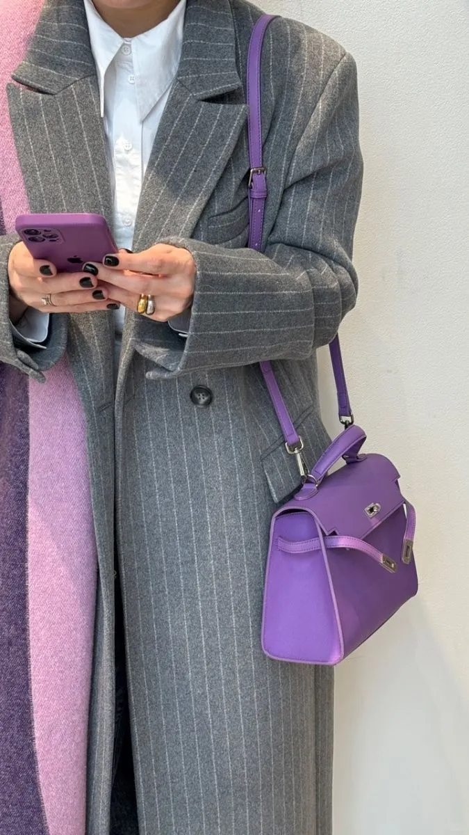 像这种高饱和度紫色可用作小面积点缀,选择小件紫色单品,比如紫色包包。