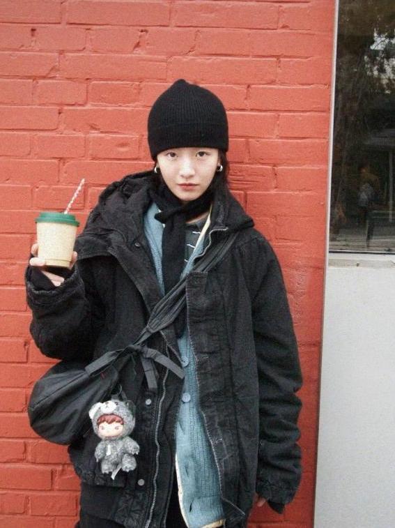 最吸引人的点是头上戴了个针织帽,耳朵上有对金色的耳坠,十分酷炫,李女士看起来就很喜欢走这种风格。
