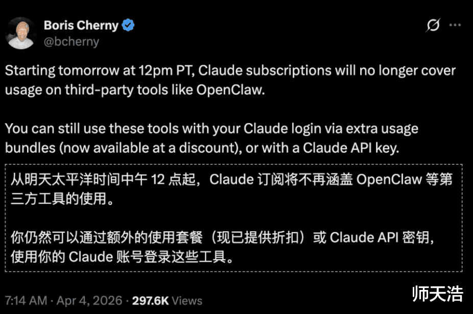 2026年4月4日,美国大模型头部公司Anthropic旗下AI 编程工具Claude Code负责人Boris Cherny发文称,美国西部时间4月4日中午12点起,Claude订阅服务将不再包含对Open Claw等第三方工具的使用额度。