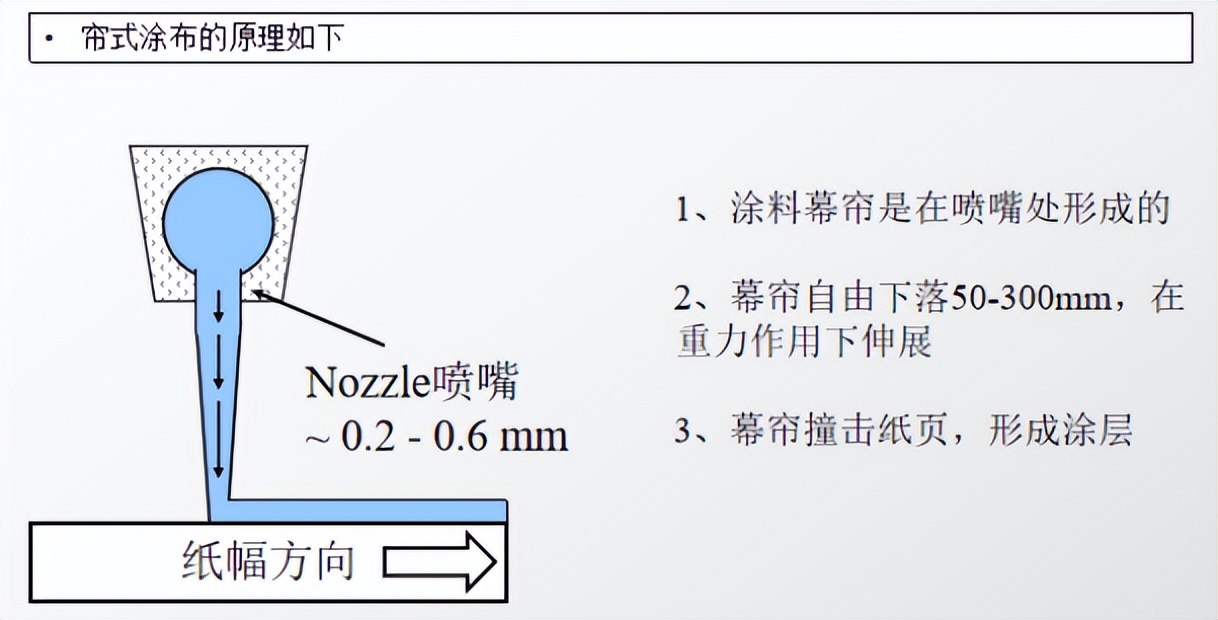 在帘式涂布中,幕帘下落会对纸幅产生冲击,然后在纸幅作用下加速并随纸幅运行,直至同纸幅速度相同时,涂料沉积于纸幅上形成涂层。涂料幕帘是在喷嘴处形成的;幕帘自由下落50~300mm,在重力作用下伸展。