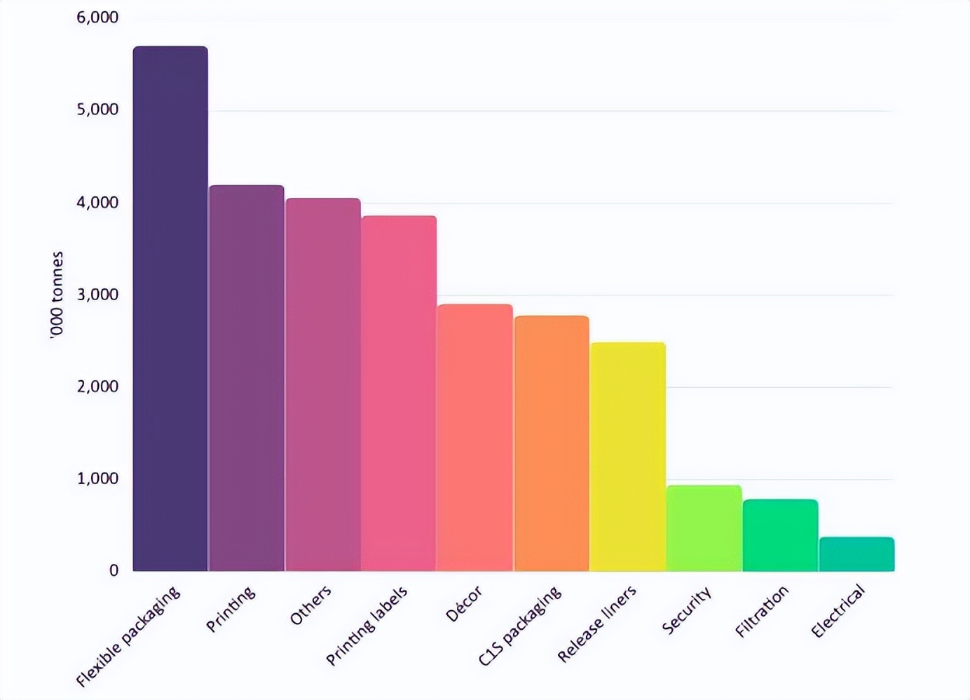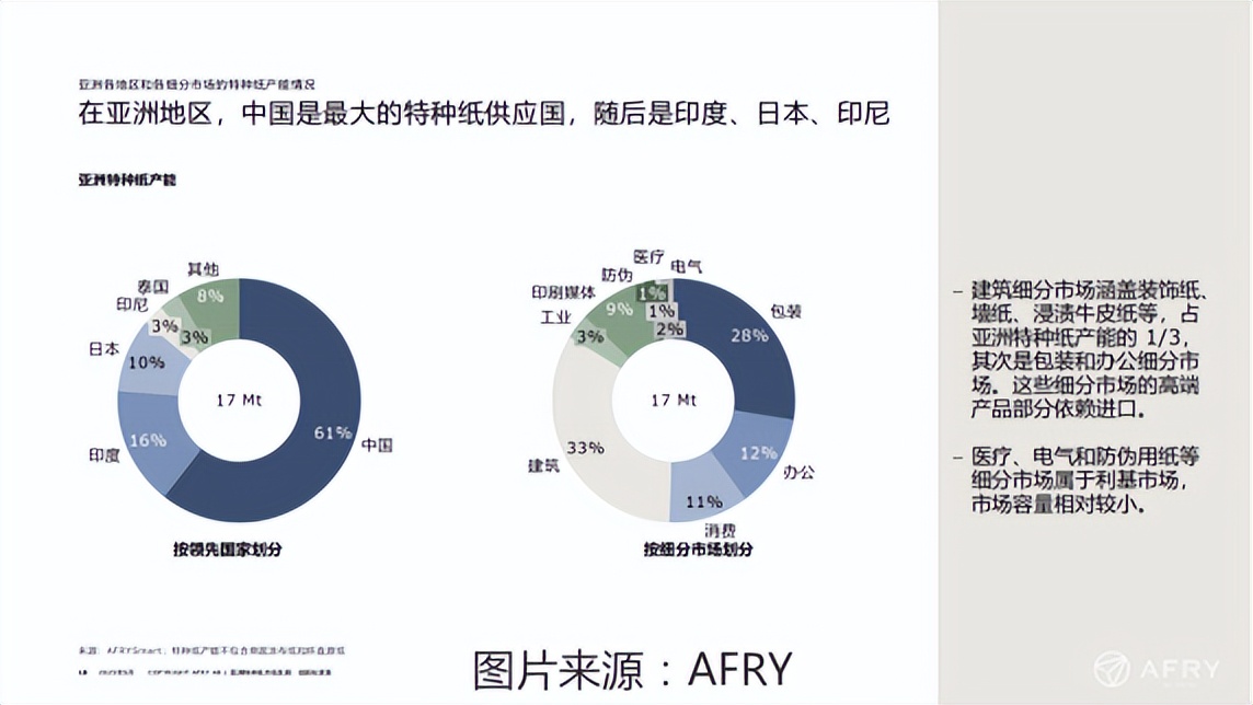 过去十年,全球新增特种纸产能有大半来自亚洲,中国更是其中的主力。目前中国拥有亚洲约60%的特种纸产能,是最大的市场;印度、日本、印尼、泰国等国合计约占20%。亚洲特种纸应用领域广泛,以装饰建材、包装、办公消费等为主,医疗、防伪等则相对小众。近年来,下游包装、消费、建筑行业的蓬勃发展也直接带动了亚洲特种纸市场的快速成长。