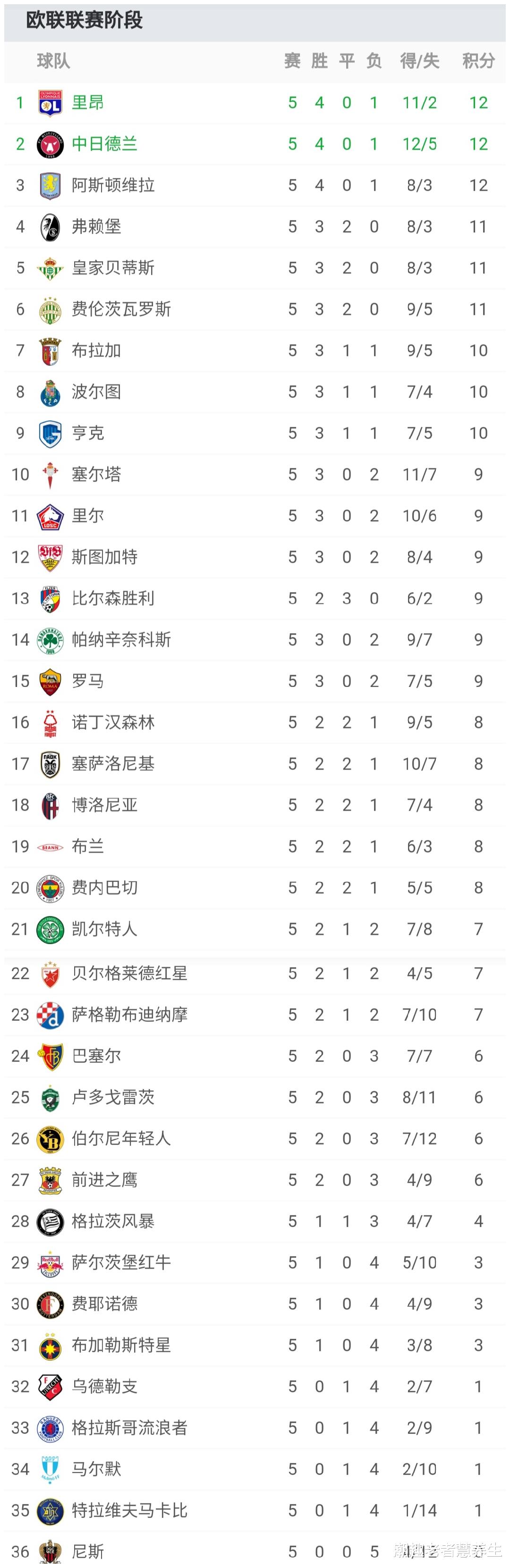 五轮战罢,欧联杯最新积分榜正式出炉。根据赛制,前八名将直接晋级淘汰赛,第9至24名则需进行残酷的附加赛争夺剩余名额。本轮过后,各队命运的分水岭已清晰可见,接下来的每一场比赛都至关重要!