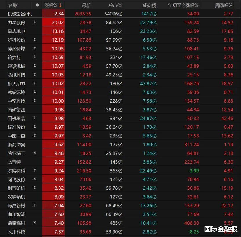 10只机械设备个股涨停,力星股份“20cm”涨停,昊志机电、步科股份、博盈特焊、铂力特涨幅超过10%,弘讯科技、航天动力、冰轮环境、中坚科技、南矿集团、国机重装、标准股份、中国一重涨停。