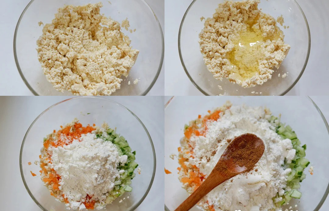 1️⃣豆腐压碎,加入1个蛋白,蛋黄放一旁备用,加入黄瓜、胡萝卜碎,2汤勺面粉,少许盐、五香粉拌匀;