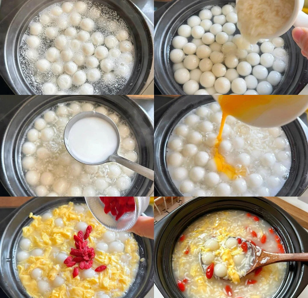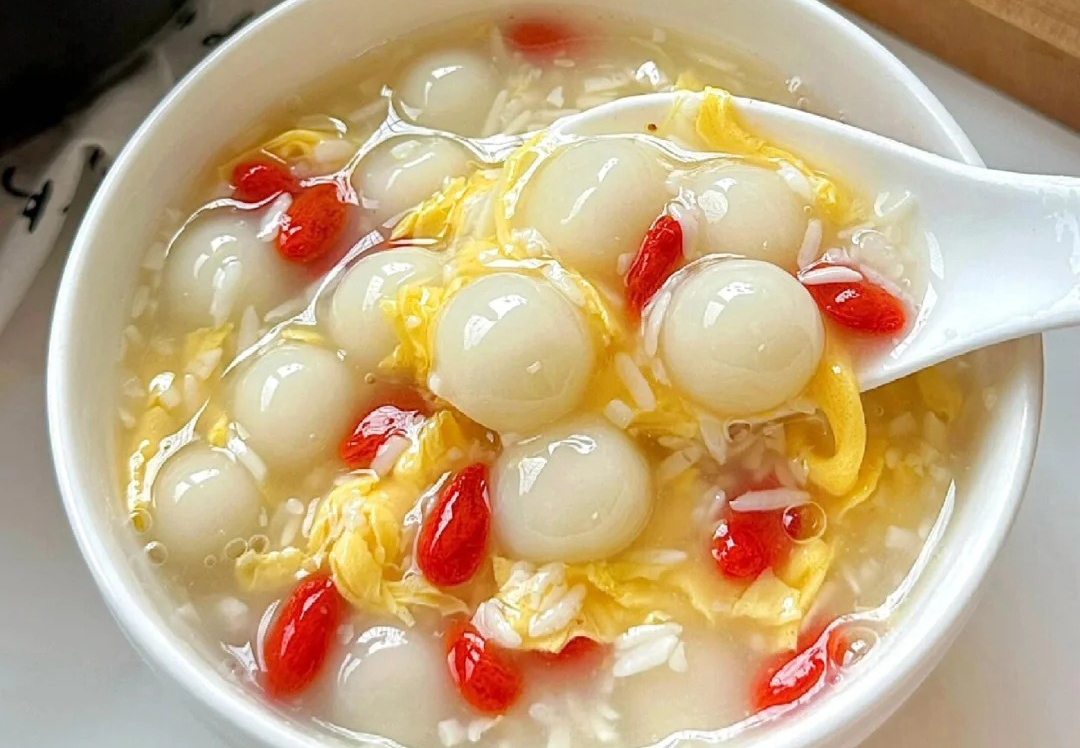 ✅ 亮点:米酒汤圆蛋花汤,煮一煮就能吃。盛出一碗,看着就让人心动——米酒香甜,汤圆软糯,蛋花鲜嫩,桂圆和枸杞点缀其中,每一口都充满幸福感。红糖暖身,营养均衡,喝上一口全身暖洋洋的,特别适合当早餐。