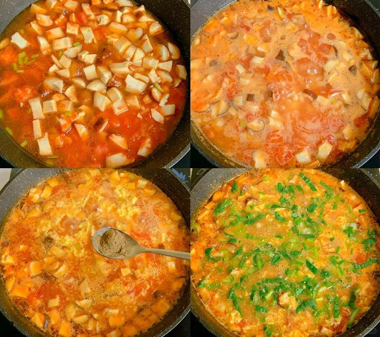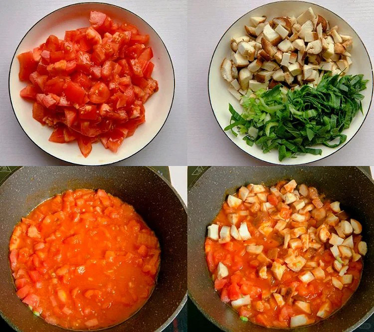 2️⃣锅中放油,放香葱爆香,放番茄炒出汁,放香菇,放适量清水,水开后撒上疙瘩;