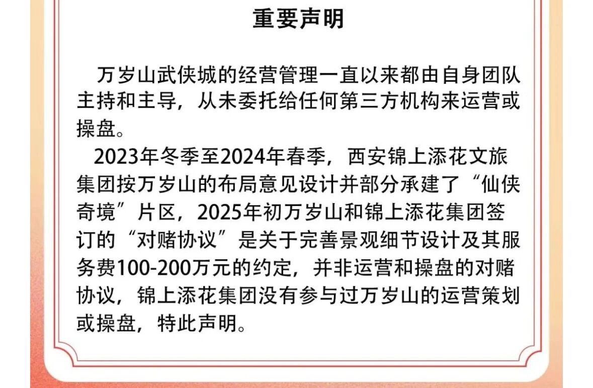1月1日,开封万岁山武侠城发表重要声明,澄清西安锦上添花从未参与万岁山武侠城的运营策划和操盘,所谓“对赌协议”不过是设计完善服务费,约100-200万元。万岁山的经营管理一直是由自身团队主持。