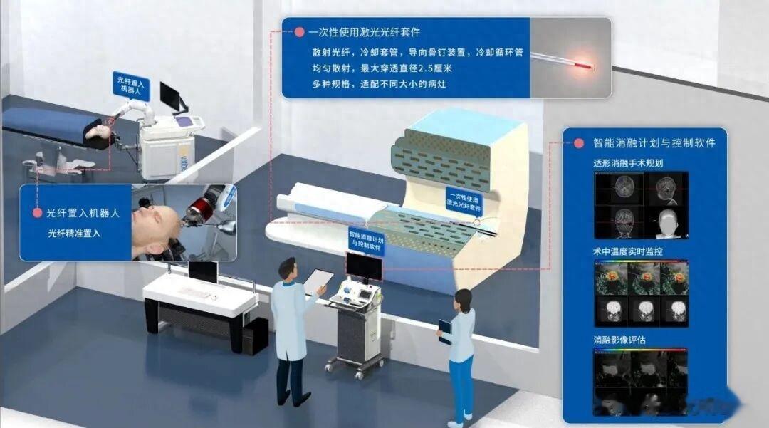 手术过程中,医生在立体定向框架或神经导航系统的引导下,将一根极细的,带冷却循环套管的光纤探针直接穿刺进入脑内的致痫病灶中。这根光纤连接着半导体激光器,一旦启动,激光能量会在探针顶端转化为热能。