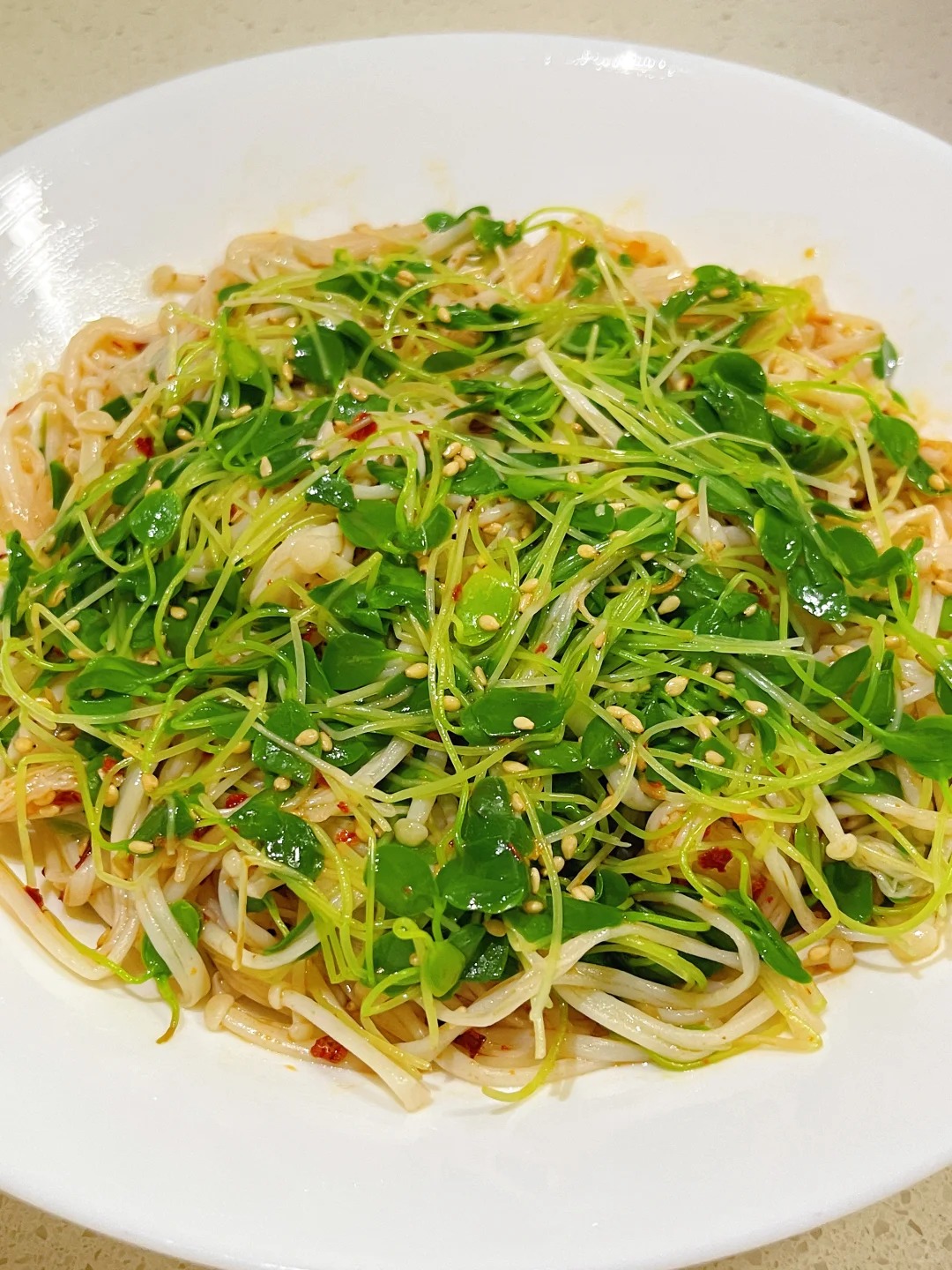 3️⃣攥干金针菇水分,豆苗控干水分,加芝麻、盐、味精香醋、香油、辣椒油,拌匀即可。