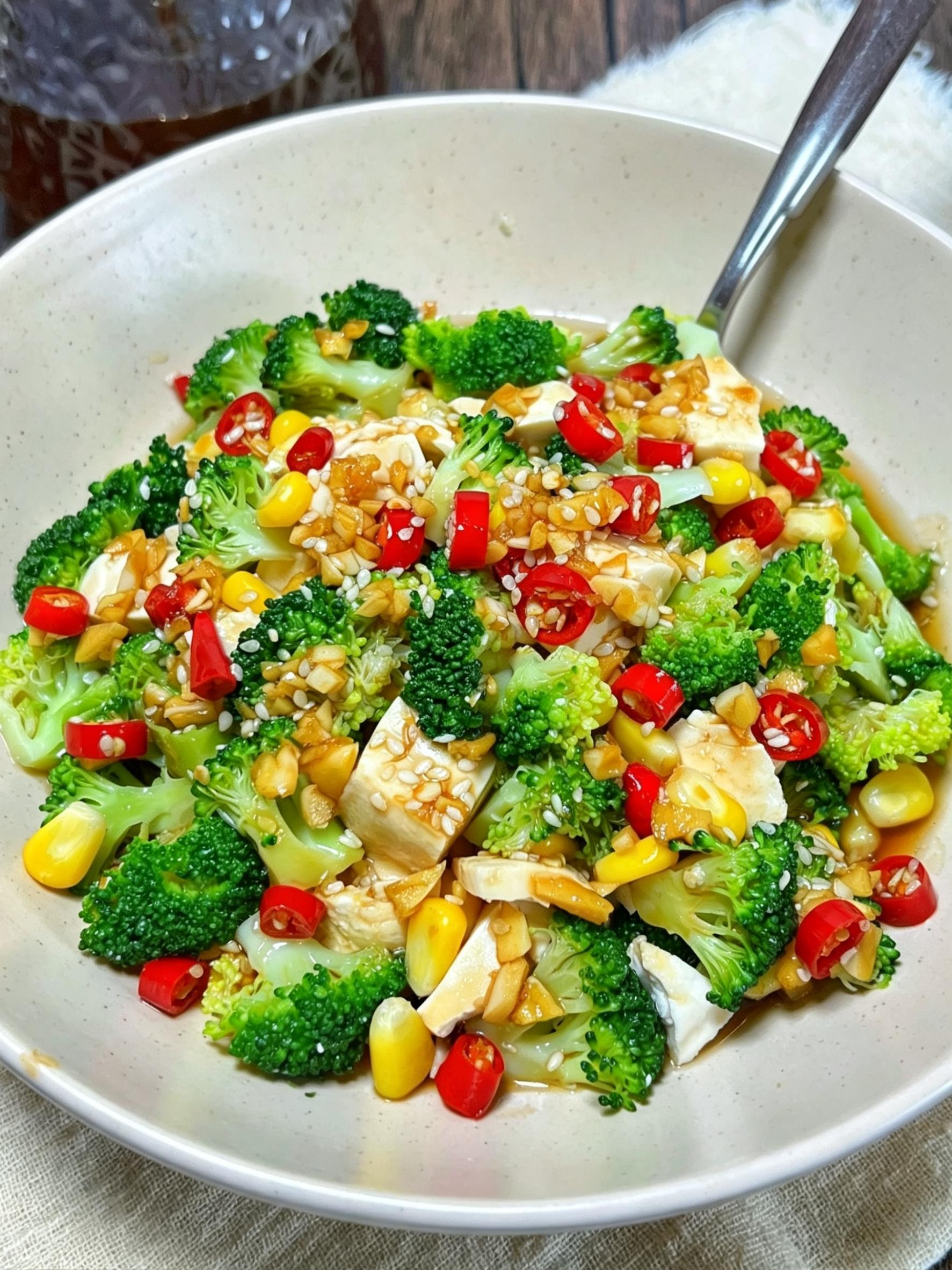 ✅ 亮点:西兰花脆嫩、豆腐软滑、玉米粒清甜,三样拌在一起,口感很丰富。豆腐补植物蛋白,西兰花和玉米带来膳食纤维,饱腹又低卡。这道凉拌菜不用多油多盐,简单一拌就清爽好吃,减脂期当主食或配菜都合适,大人小孩都爱。