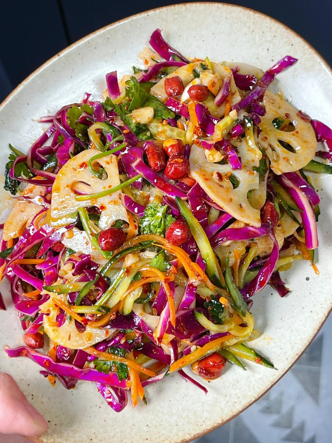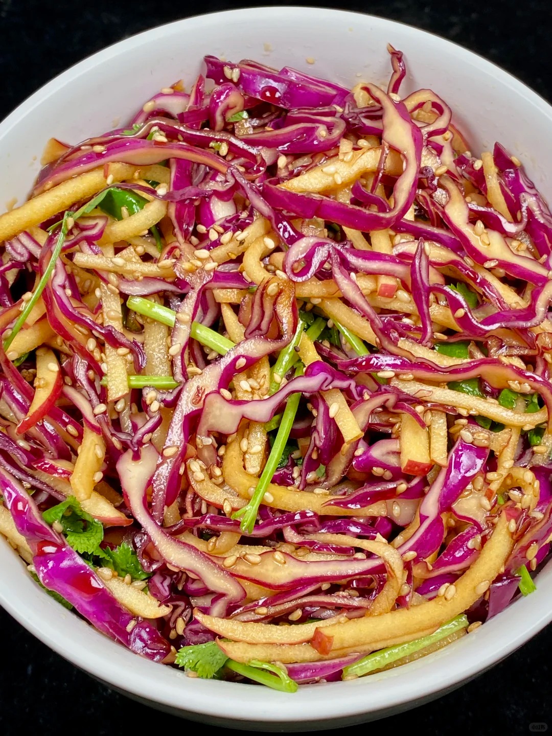 1️⃣先把紫甘蓝切成丝,摆在盘子里,再切点苹果丝放进去。苹果丝别切太细哈,不然一拌就碎了。接着抓一把香菜扔进去,香菜可是这道菜的灵魂,喜欢吃的就多来点。