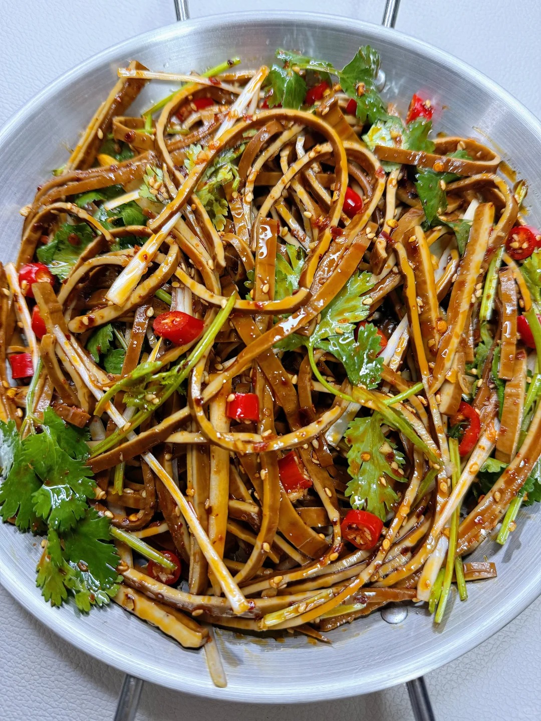 ✅ 亮点:牛皮豆干丝嚼劲十足,搭配香菜独特的清香,再加点醋和辣椒油凉拌,酸辣开胃。豆干提供优质植物蛋白,香菜助阳气生发,低脂低卡又解腻。这道菜特别适合春天减脂期,不想炒菜时拌一盘,爽口过瘾,配粥下饭都合适。