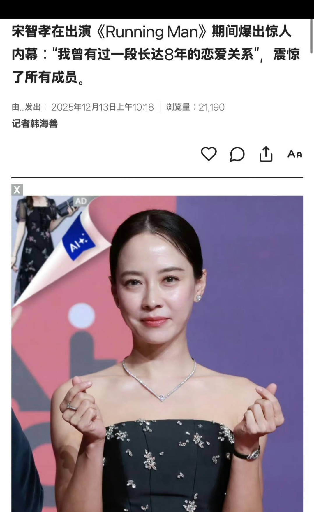 “懵智这保密工作也太绝了吧!”12月14日,最新一期《RunningMan》播出后,#宋智孝自曝8年恋爱##宋智孝保密能力超越金钟国#两大话题火速冲上热搜,单日阅读破5亿。节目中宋智孝坦然承认曾有一段长达8年的隐秘恋情,且这段感情与《RunningMan》录制期高度重叠,连朝夕相处的成员都毫不知情,网友直呼“比金钟国的婚礼还神秘”。