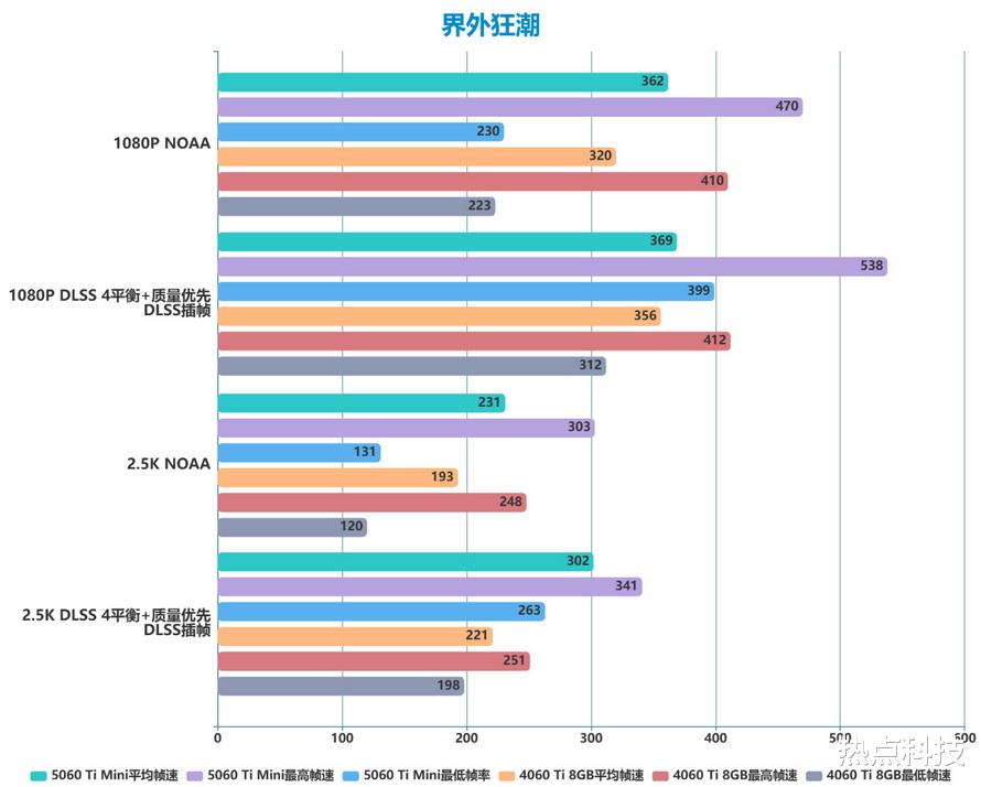 接下来是游戏实测,《界外狂潮》是网易今年推出的新游戏,是一款5v5英雄射击网游,支持DLSS技术。在高画质+1080P NOAA场景下,iGame RTX 5060 Ti Mini平均帧速可以362FPS,比RTX 4060 Ti 8GB多出42FPS,画质不变下提升至2.5K分辨率下,二者差距依然有38FPS,可见甜点级显卡光栅性能依然能够满足网游需求。