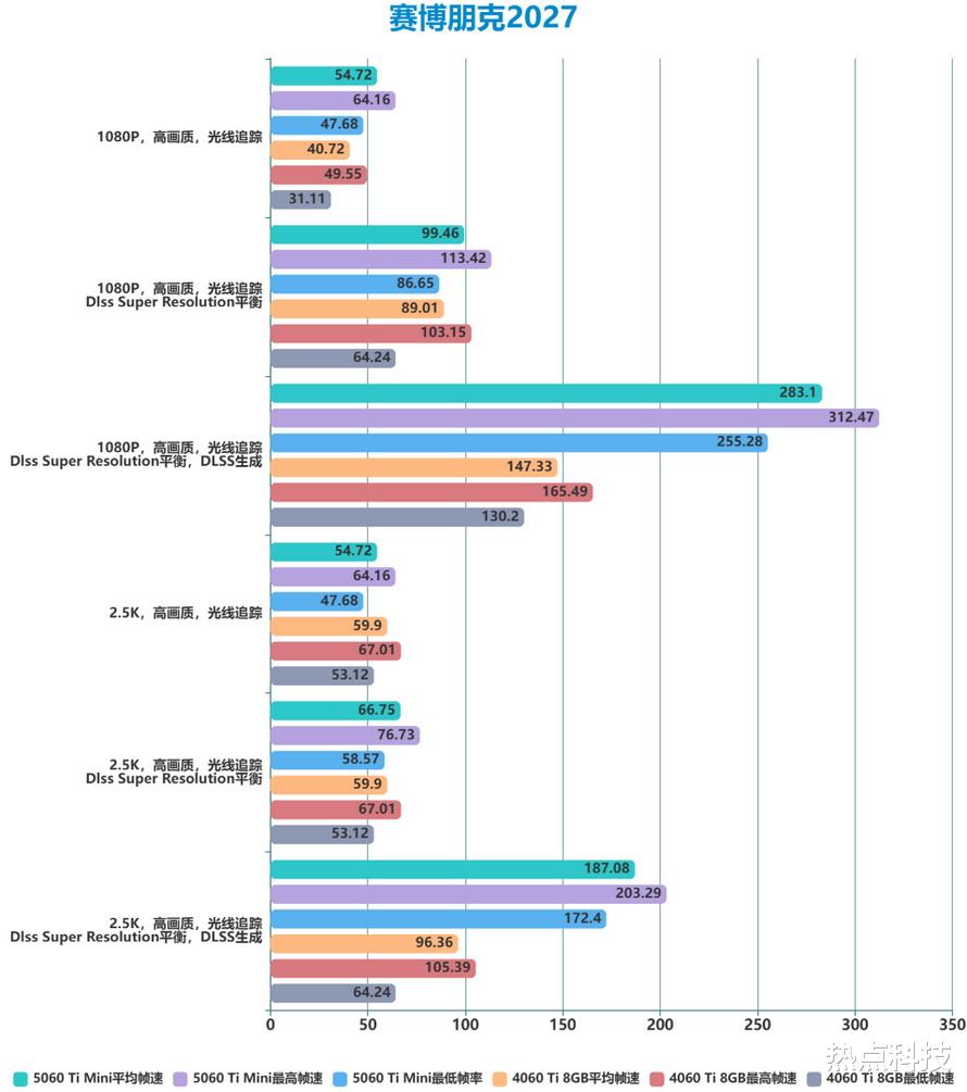 《赛博朋克2077》是一款经典3A大作,在今年初更新后支持DLSS 4技术,因此iGame RTX 5060 Ti Mini表现再次遥遥领先。在高画质、开启光线追踪、DLSS Super Resolution平衡以及开启DLSS帧生成下,iGame RTX 5060 Ti Mini在1080P、2.5K分辨率下,平均帧速分别是283.1FPS、172.4FPS,而RTX 4060 Ti 8GB对应平均帧速分别只有147.33FPS、93.36FPS,分别只有前者52%、54%性能。。