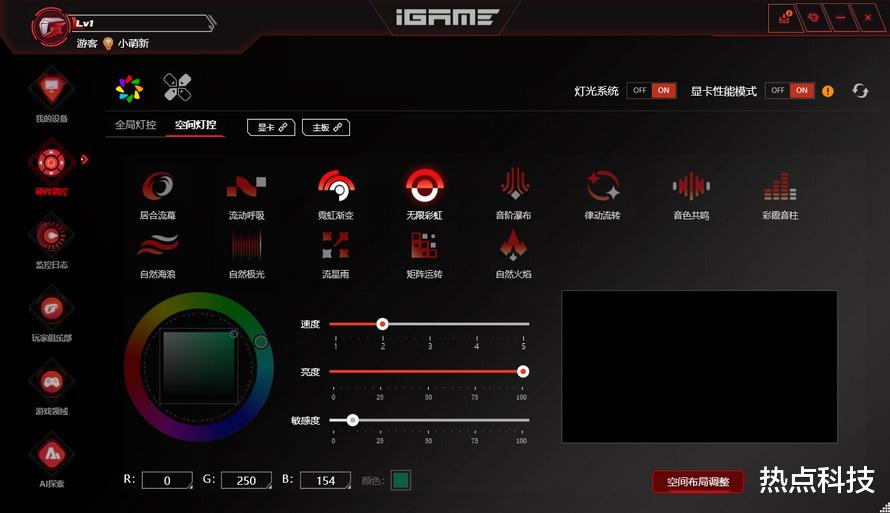 说到RGB自然不能不提软件iGame自在星球,经历iGame Zone、iGame center、iGame Center Al Upgarde多次迭代,iGame自在星球已经不只是一款简单调节RGB灯效、监控电脑信息的软件。在灯光效果方面,它加入了空间灯效模式,能够兼容两种内存灯光底层,让不同品牌、不同型号内存都能拥有一致的灯光效果。如果你使用了多款七彩虹设备时,iGame自在星球在启动时,会自动加载不同的底层代码,不但能更好适配不同硬件,而且下载的数据量更少,保持系统干净。