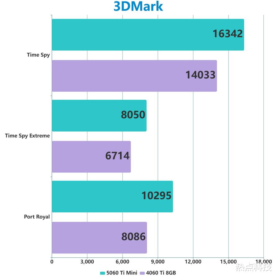 对于游戏显卡评测,3DMark是一个必不可少的项目,它能够反应显卡传统光栅性能以及光追性能。iGame RTX 5060 Ti Mini在基于DX12的Time Spy、Time Spy Extreme得分分别是16342、8050,而在Port Royal光线追踪测试得分是10295,比RTX 4060 Ti 8GB分别高出了16.5%、19.9%、27.3%。