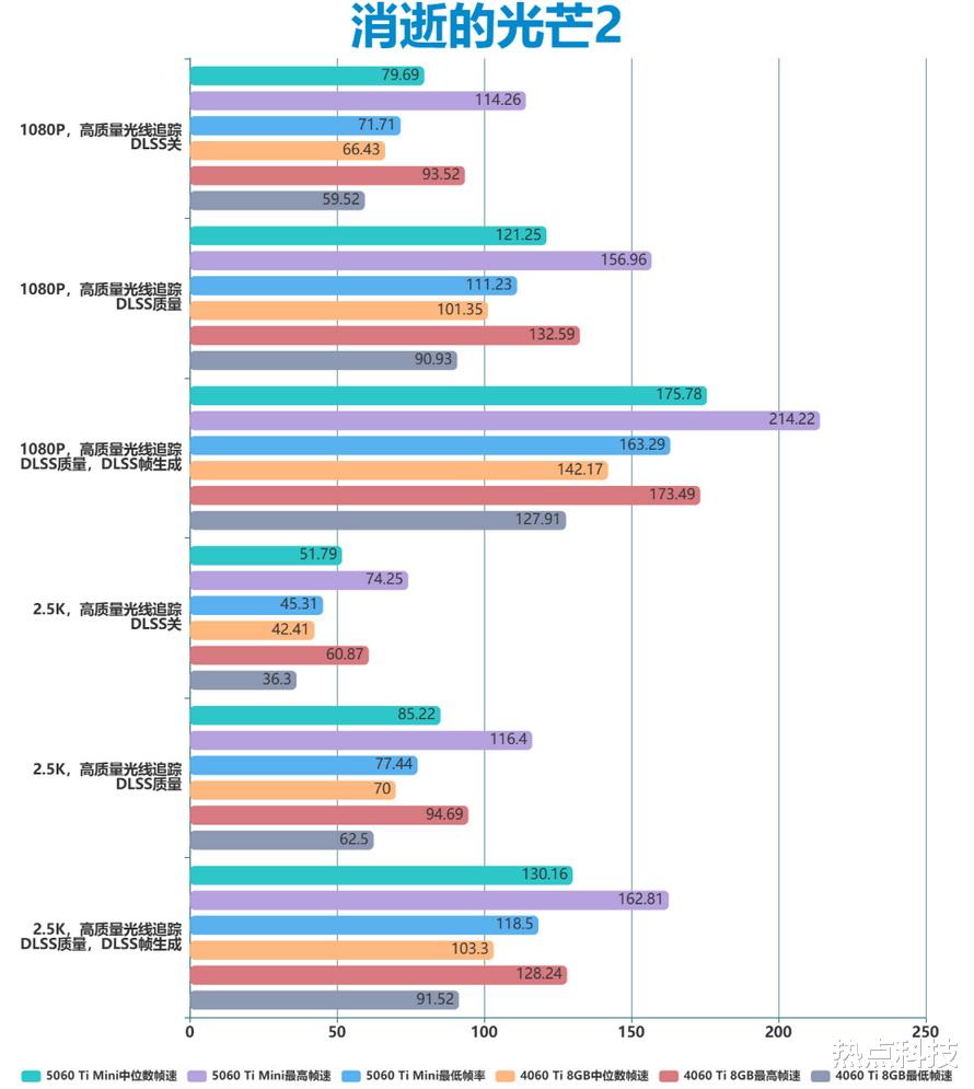 最后一款游戏也是3A作品《消逝的光芒2:人与仁之战》,在高亮光线追踪+DLSS质量+DLSS帧生成下,iGame RTX 5060 Ti Mini在1080P、2.5K下平均帧速分别是175.78FPS、130.16FPS,比RTX 4060 Ti 8GB分别高出23.6%、26%。通过上述测试可以看出,iGame RTX 5060 Ti Mini在DLSS 4多帧生成加持下,游戏平均帧速能比RTX 4060 Ti 8GB高出1倍左右,即使在不支持DLSS 4的游戏中,帧速高出两三成也是常有,比上一代显卡提升非常显著。
