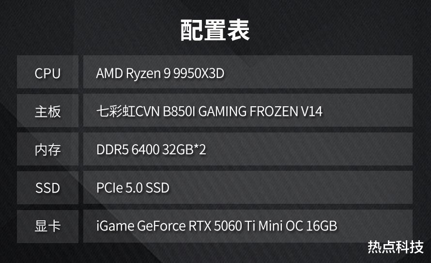 接下来我们看看性能实测,测试基于AMD平台进行,处理器是AMD Ryzen 9 9950X3D,主板是七彩虹CVN B850I GAMING FROZEN V14,搭载了DDR5 6400 32GB*2内存与PCIe 5.0 SSD。