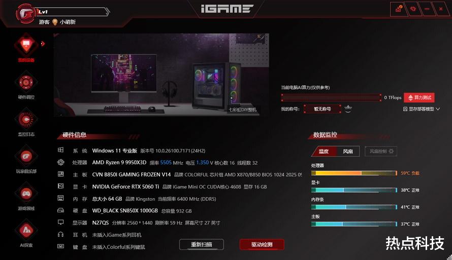 从性能上看iGame GeForce RTX 5060 Ti Mini OC 16GB,GPU加速频率达到了2.63GHz,在DLSS 4支持下游戏帧速是上一代翻倍不是梦,在16GB大显存加持,运行推理形式AI任务也游刃有余,更重要的单风扇小巧设计,既满足散热需求,又能安装到mini ITX机箱当中,小主机用户也能获得满血的性能体验。而且iGame自助星球软件通过AI,大大简化超频、灯光控制、切换电脑工作模式,让用户能够更专注于体验游戏、搞创作当中。