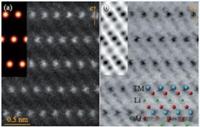 图3 LiTMO2结构沿[100]方向的HAADF-STEM(a)和ABF STEM(b)高分辨图