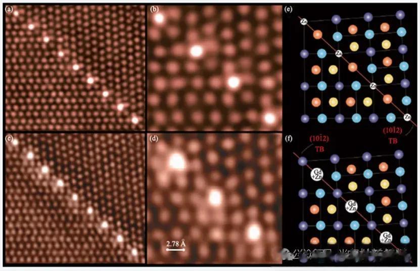 图2 孪晶晶界处溶质原子周期性排列。(a),(b)为Mg-1.9at.%Zn合金孪晶界处HAADF-STEM图像;(c),(d)为Mg-1.0at.%Gd-0.4 at.%Zn合金孪晶界处HAADF-STEM图像;(e),(f)为(c),(d)中图像的示意图,其中的TB为孪晶界