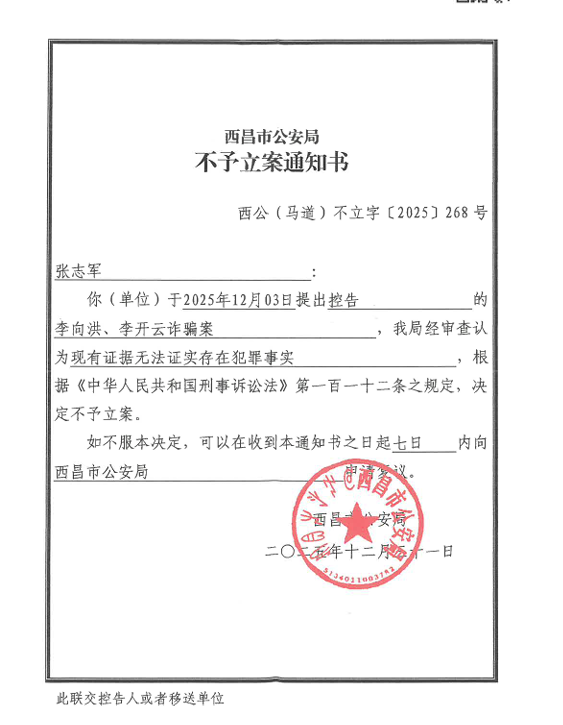 2025年3月,大秦公司就相关疑点向西昌市公安局马道派出所报案。警方受理并开展初步询问,出具了《受案回执》。但2025年12月21日,公安机关作出《不予立案通知书》,主要理由为: