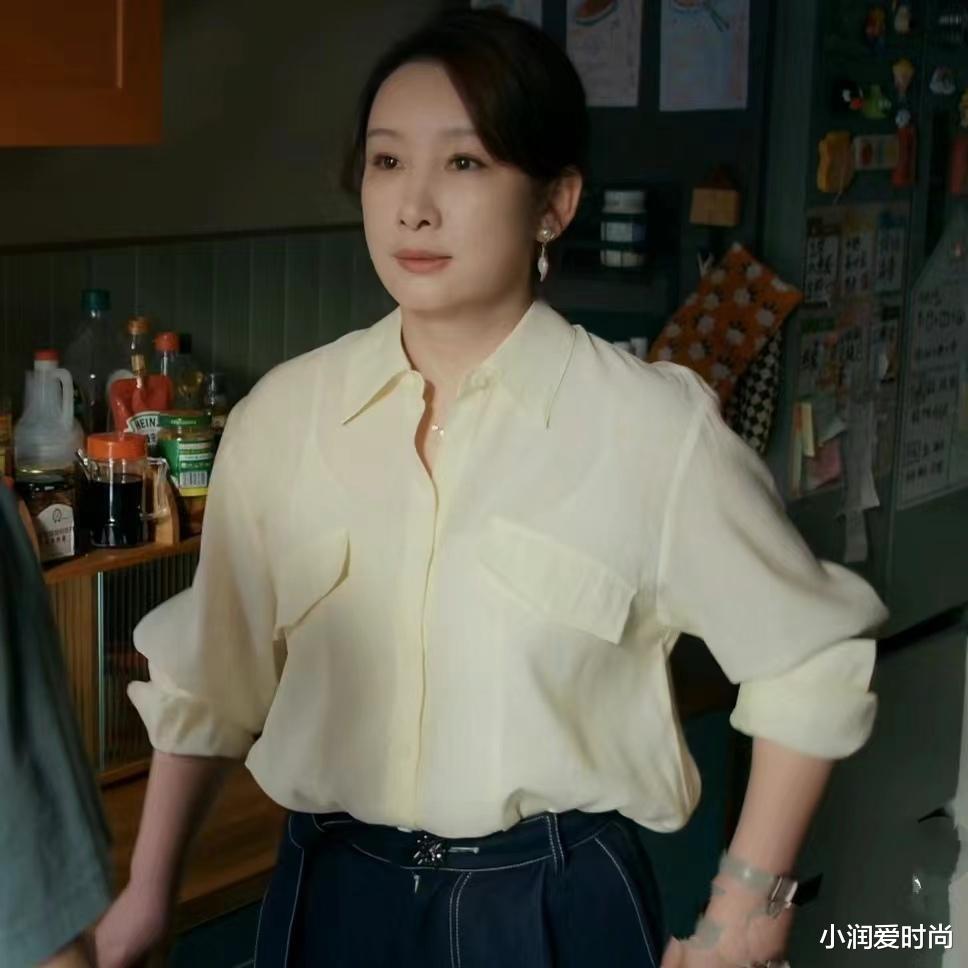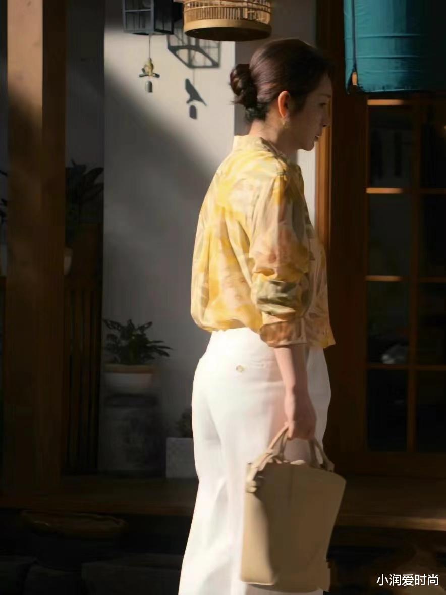 一、秦海璐《时光正好》中穿搭分享Look1:黄色印花衬衫+白色西裤+水桶包(干练)
