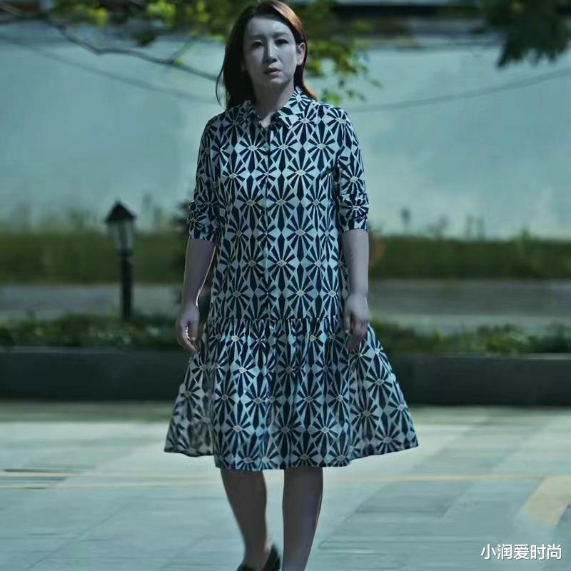 秦海璐在剧中穿藏青色衬衫连衣裙搭配裸色系高跟鞋,一身极简穿搭优雅又知性。