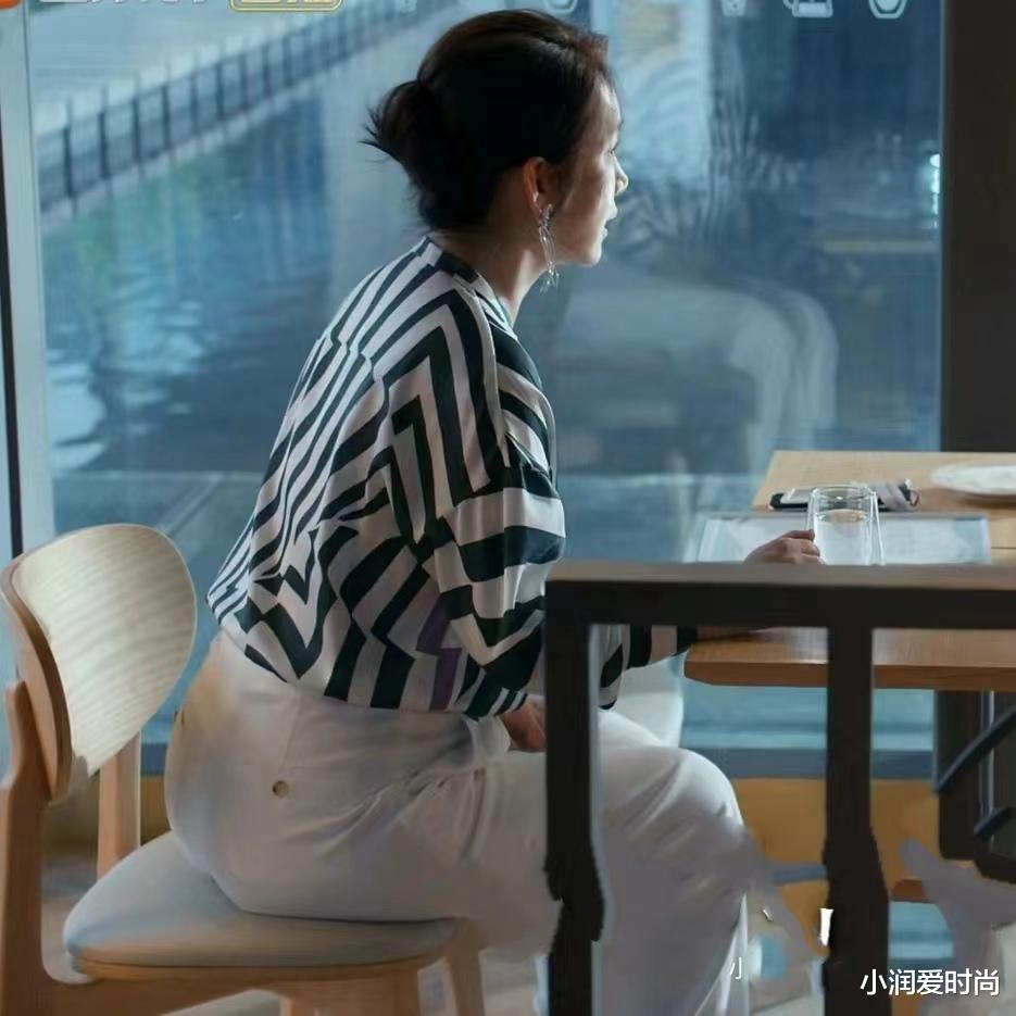 宽松版型的黑白条纹衬衫遮住了秦海璐上半身的赘肉,显瘦的同时又给人慵懒感;下半身穿白色西裤,垂顺利落给人飒爽感;再把衬衫塞进西裤里,提升了腰线。