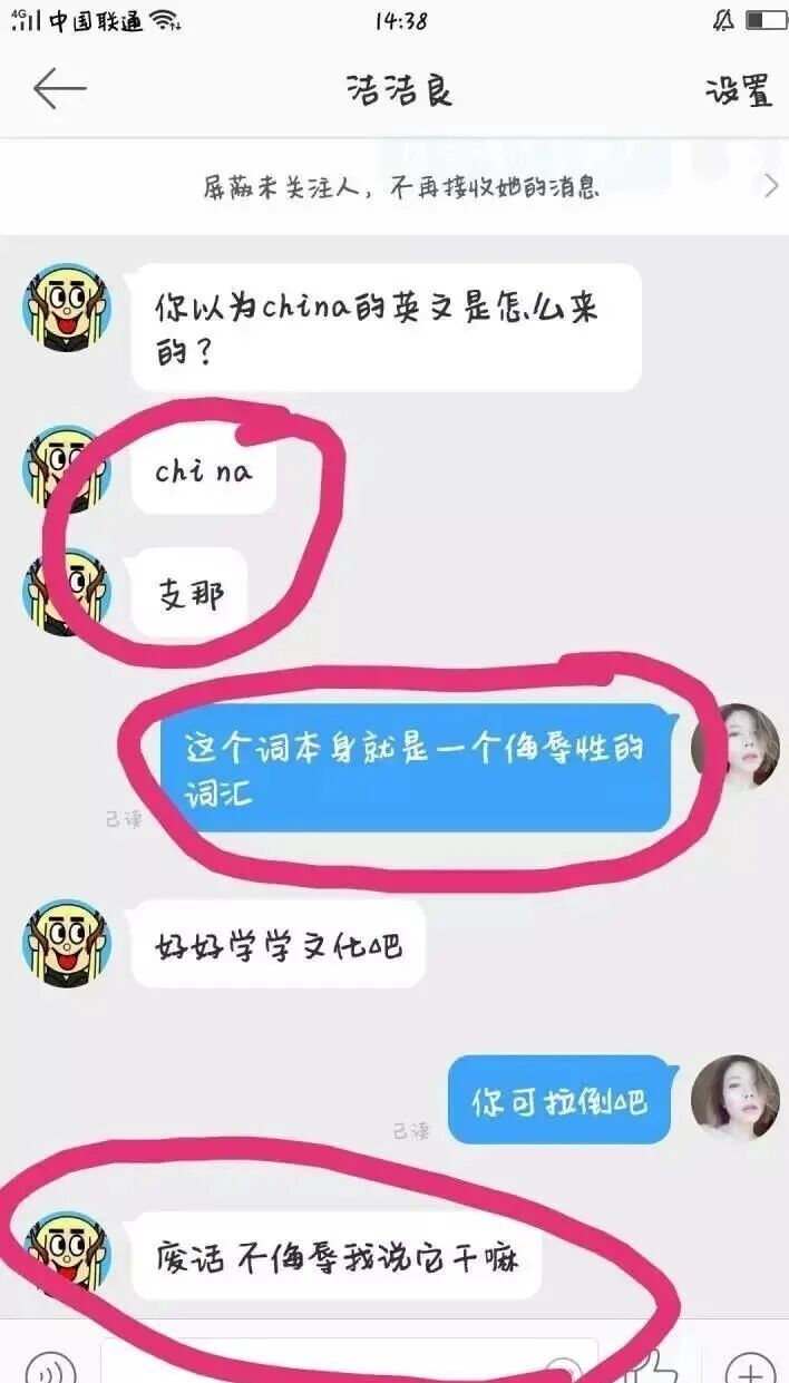 起初网友们并没有太在意,以为是写错了,但很快眼尖的网友就意识到了不对劲,并好心提醒,“支”是“支那”的简称,你是不是写错了。但是这个“洁洁良”却嚣张回应:“废话,不辱华我说它干嘛?”