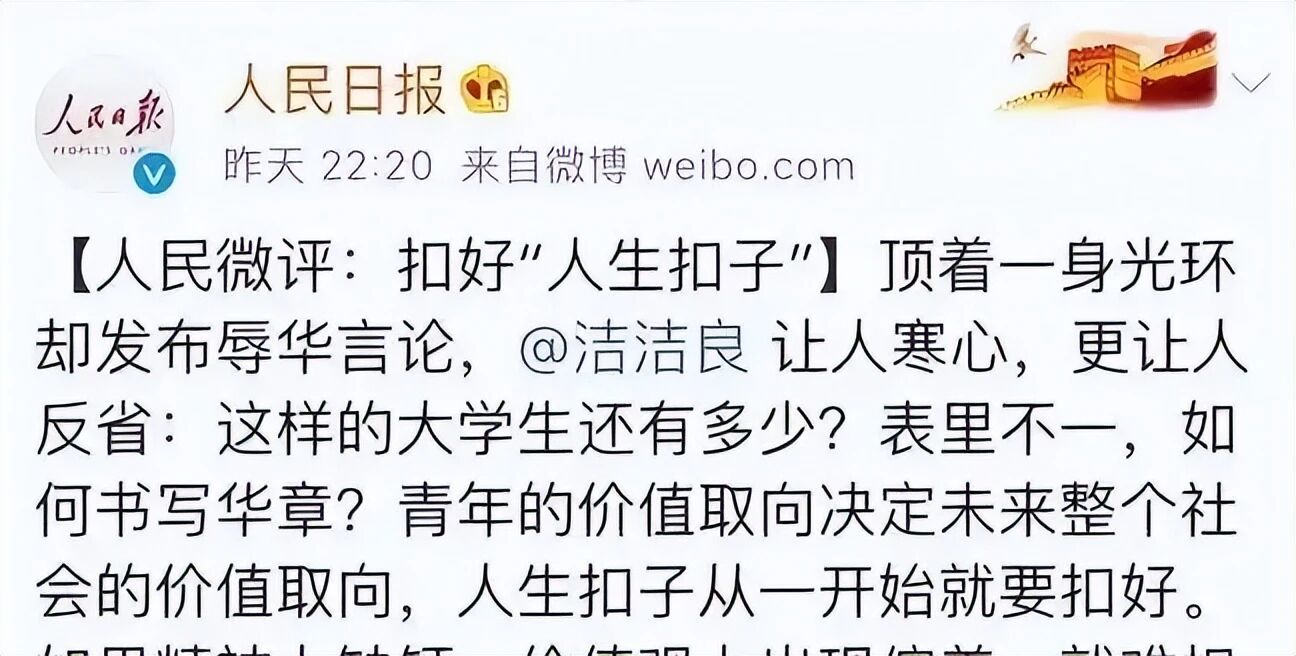 就在众人谴责这种不文明行为时,一个名为“洁洁良”的微博账号转发了相关消息,并配上了四个字:“恶臭你支”。