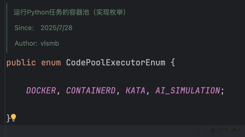 /** * 指定代码容器池运行服务的实现类 */ CodePoolExecutorEnum codePoolExecutor = CodePoolExecutorEnum.DOCKER;选择 docker:系统会在一个全新的 Docker 容器中启动 Python 解释器来执行代码。执行完毕后,容器通常会被销毁,确保了环境的干净和安全。