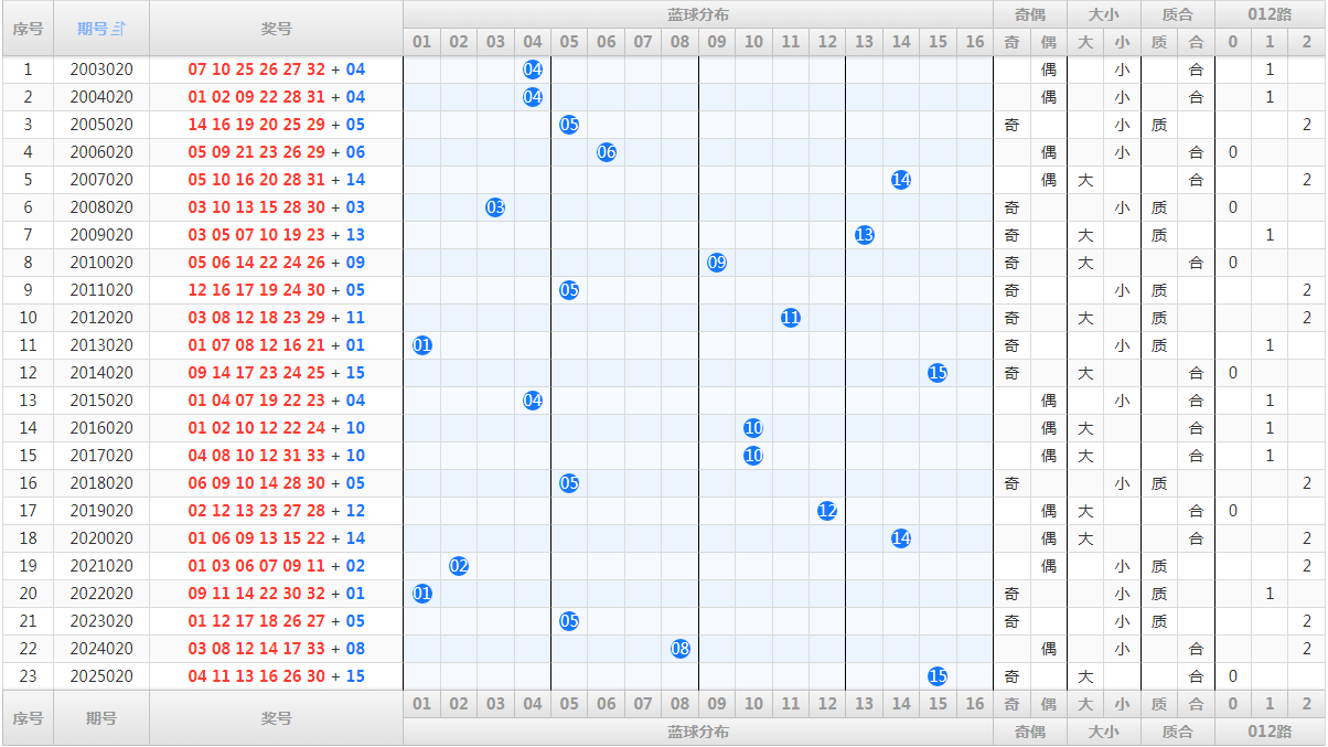 七、历史同期,蓝球开奖号码和走势图(历史数据演示):