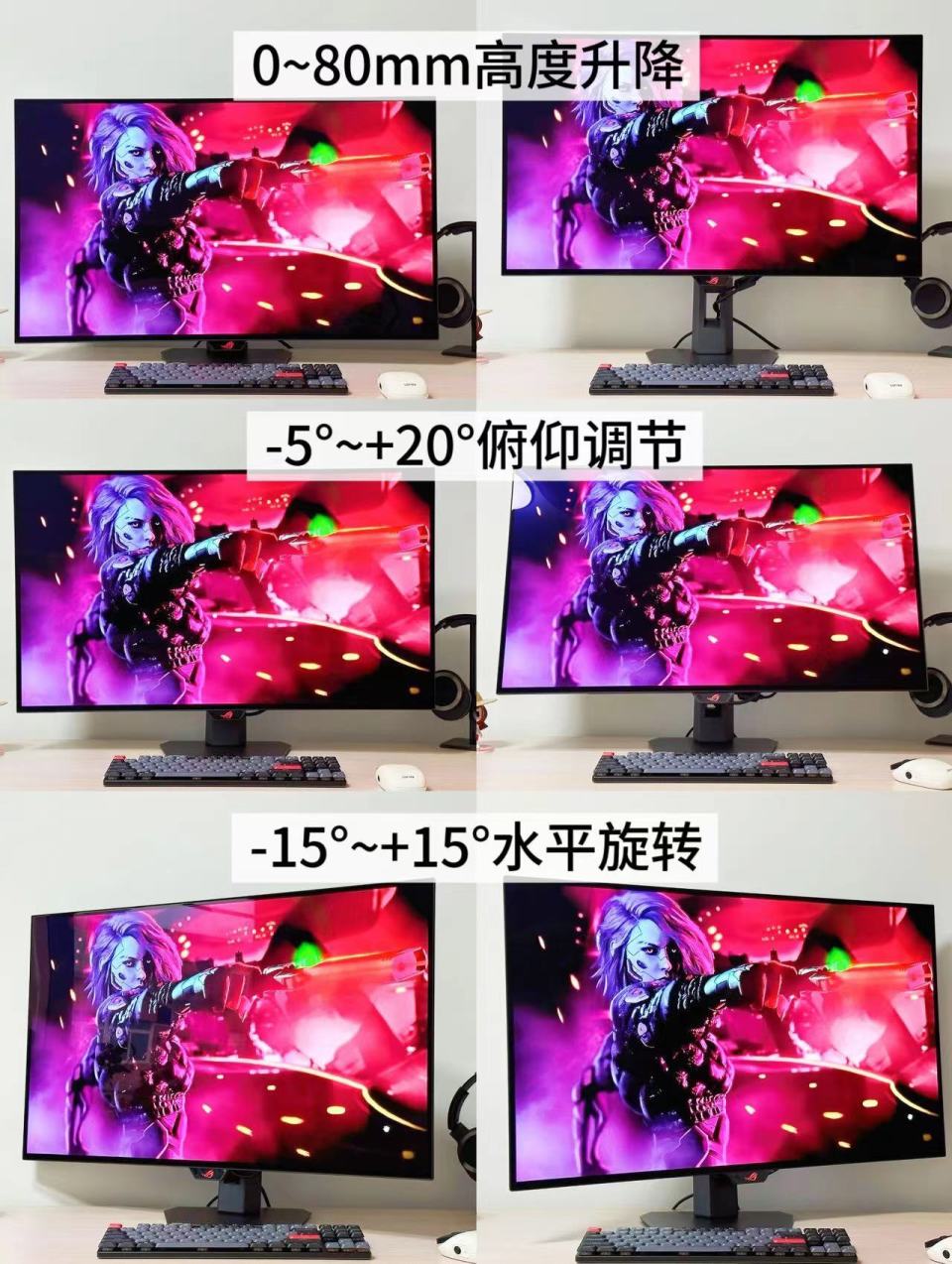 值得一提的是,ROG绝神X 双模OLED搭载的全新多维调节支架,它支持0~80mm的高度升降、-15°~+15°的水平旋转、-5°~+20°的俯仰调节,各种坐姿都能找到最舒适的观看角度,将人体工学体验推向了新高度。