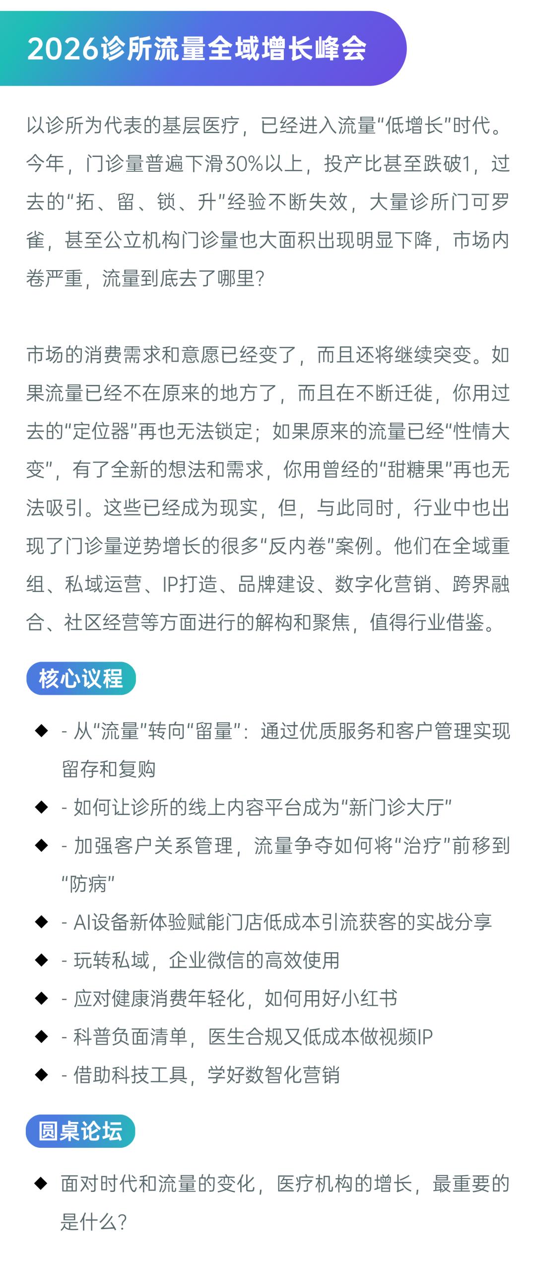 诊所内卷的困局里,怎么找到逆势增长的出路?2026诊博会-诊所流量全域增长峰会直接给你 “反内卷” 的实战解法:从 “流量” 转 “留量” 的客户管理技巧、AI 设备低成本引流、私域 / 小红书 / 医生 IP 的合规运营…… 3月3-7日,成都见!